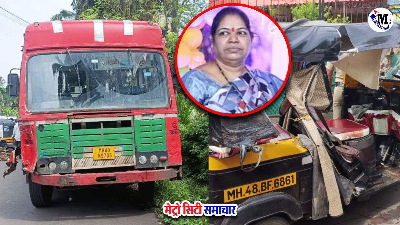 विरार,22 जून: विरार पश्चिम के अर्नाला इलाके में रविवार सुबह करीब 9 बजे एक एस टी बस और ऑटो रिक्शा की आमने-सामने टक्कर हो गई। इस दर्दनाक हादसे में ऑटो में यात्रा कर रही एक महिला की मौके पर ही मौत हो गई, जबकि ऑटो चालक समेत तीन अन्य लोग गंभीर रूप से घायल हो गए।